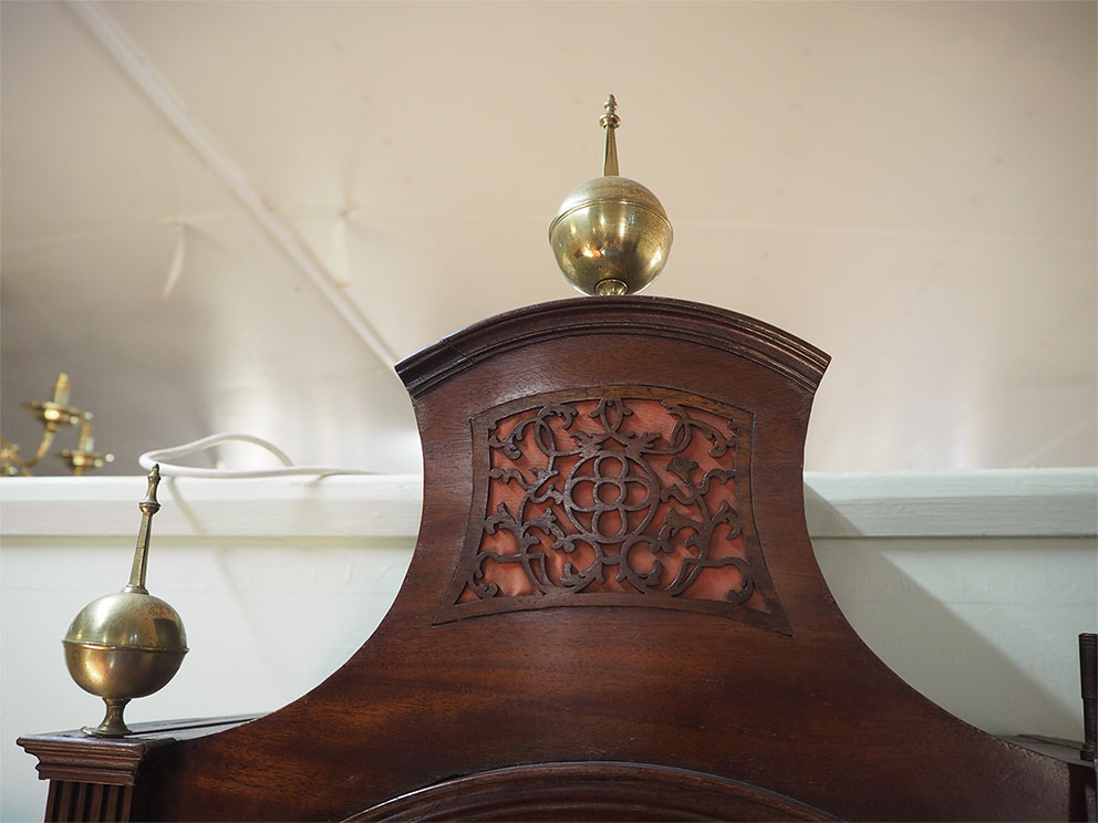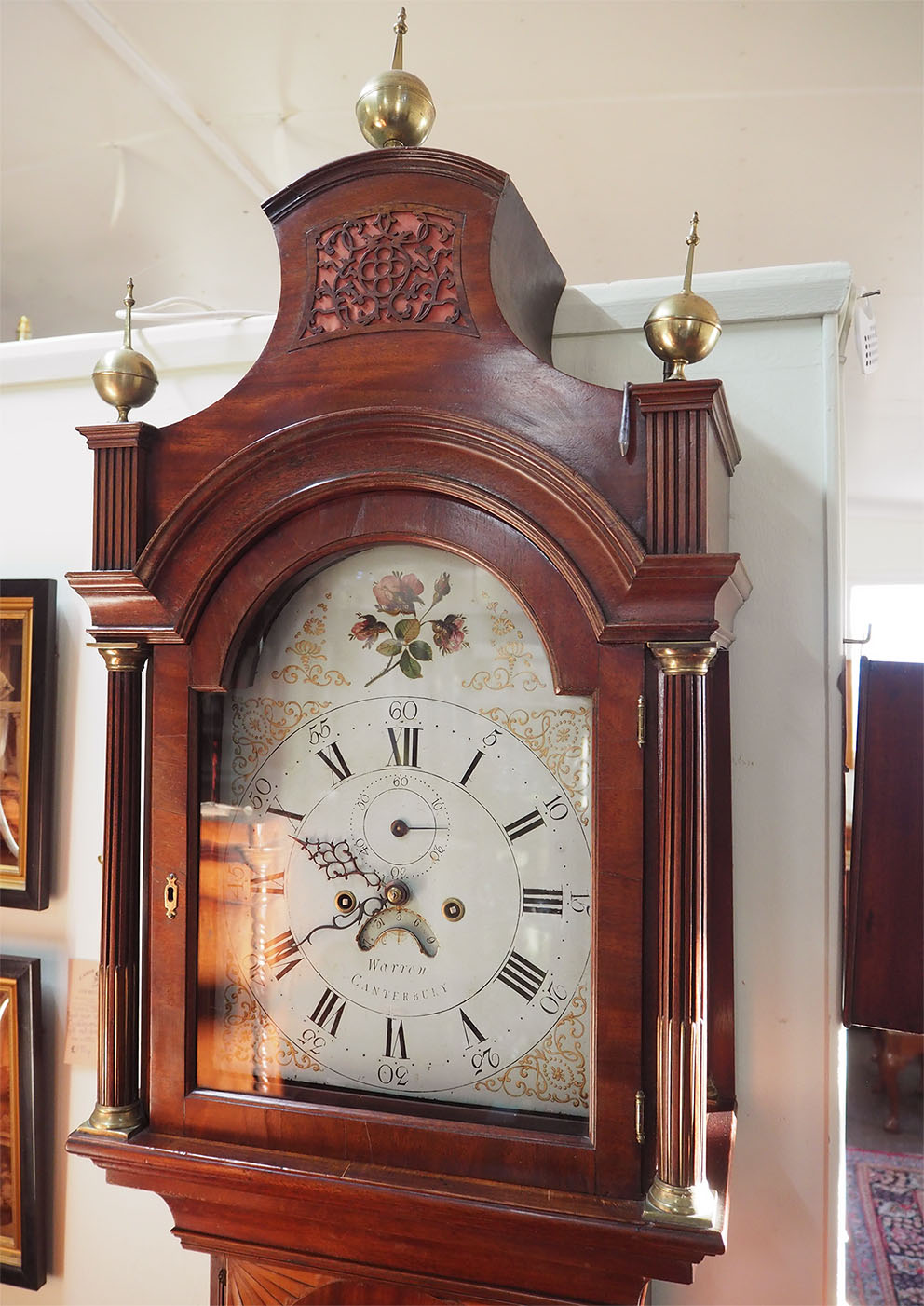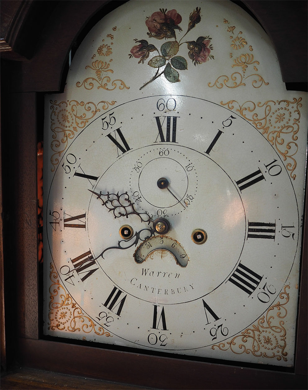 The original dial and movement, the dial is very nicely painted with gilt decoration and a refined floral design to the arch. The movement is 8 day striking on a bell at the hour and has been fully serviced. Made by JAMES WARREN of CANTERBURY.